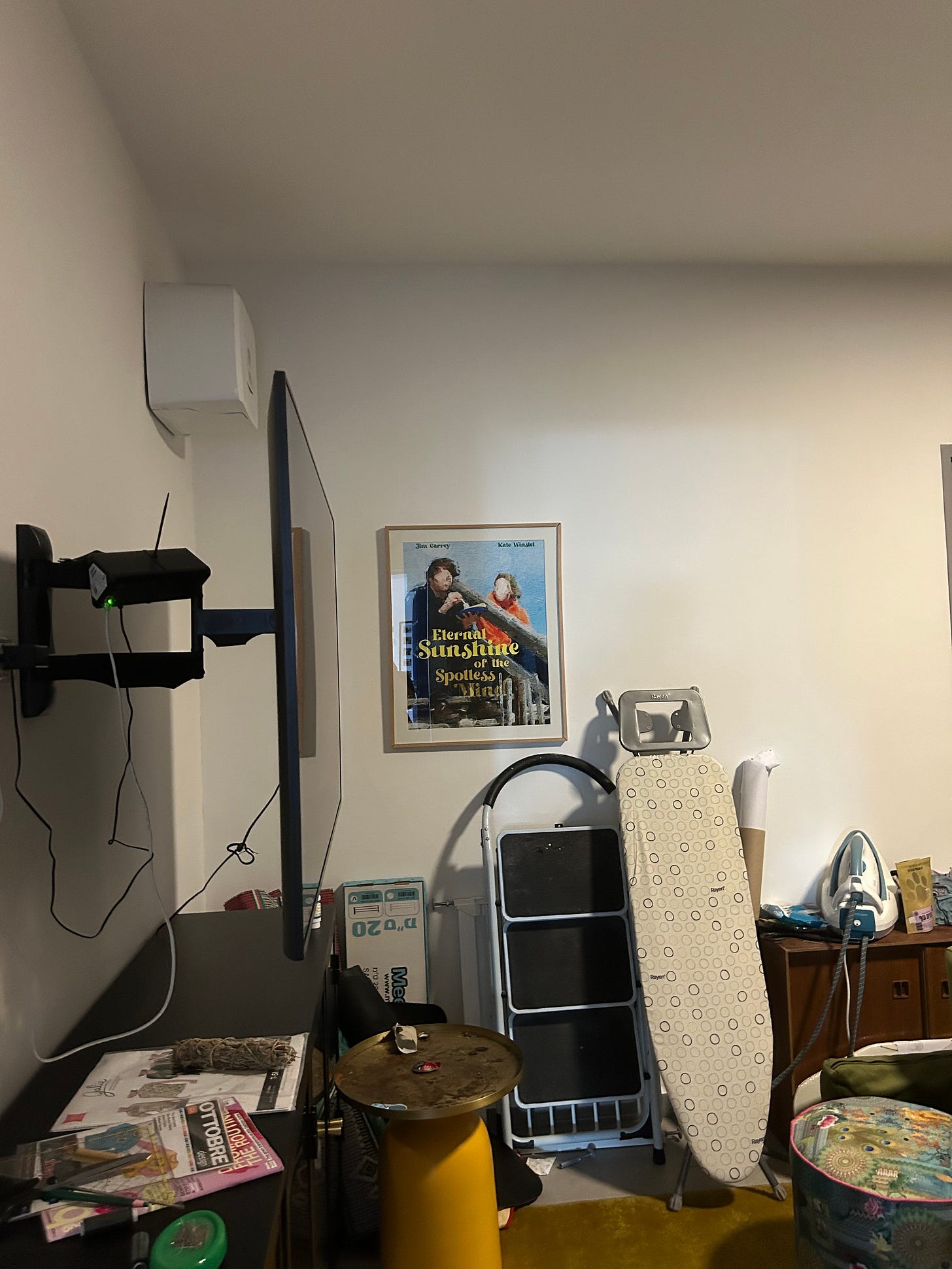 Just next to the TV, we’ve got this Eternal Sunshine of the Spotless Mind illustrated poster, which I’m obsessed with (it’s also one of my favorite films ever.) Next to the sewing table, we’ve got two more paintings by Liat LK: These were sold in black and white as canvas prints for painting, and gave us something to do over the pandemic.