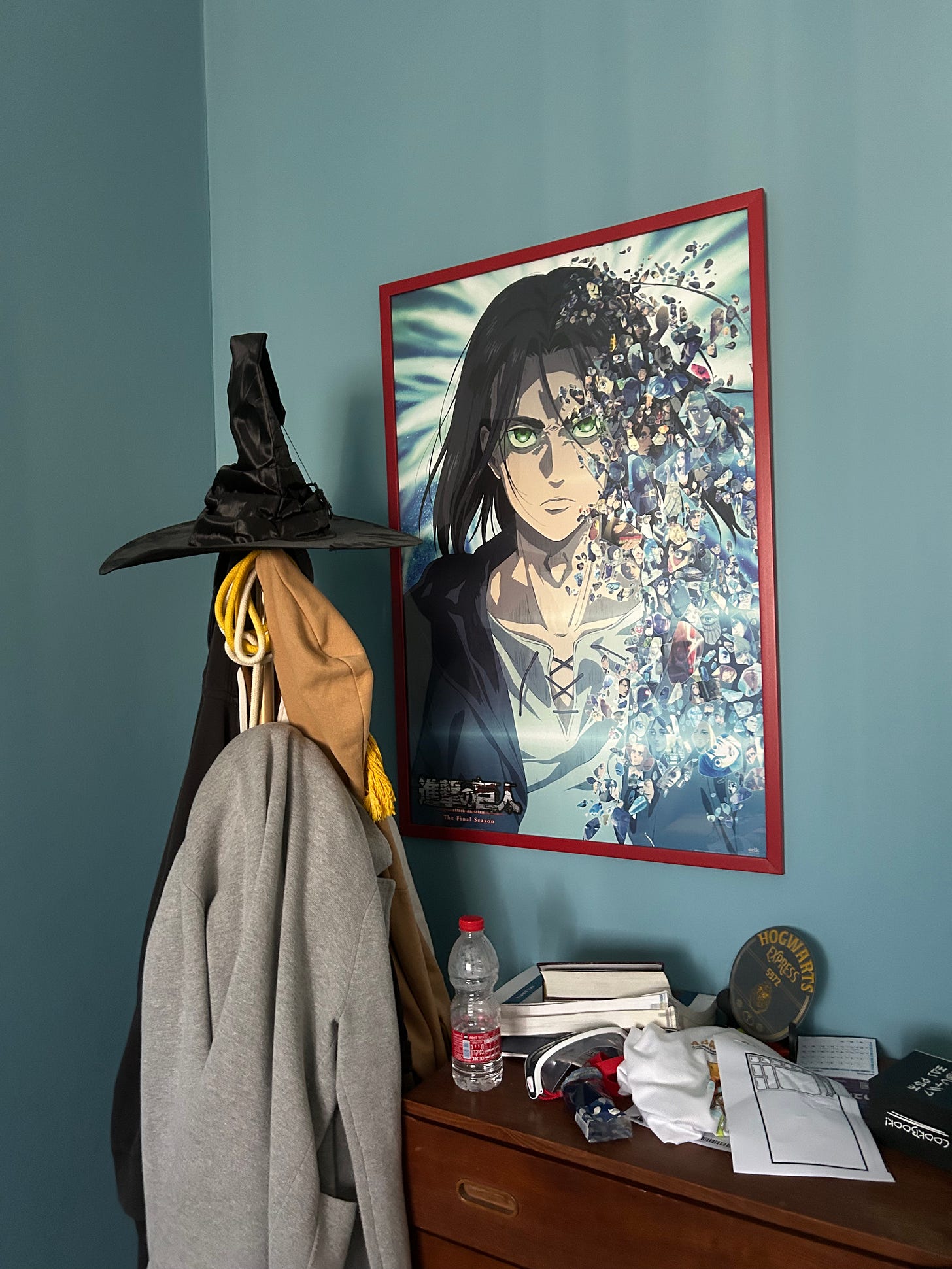 I thiiiink that’s an Attack On Titan poster but don’t hold it over me if I’m wrong. Also: all the HP merch was bought before JKR became a raging TERF. Blergh.